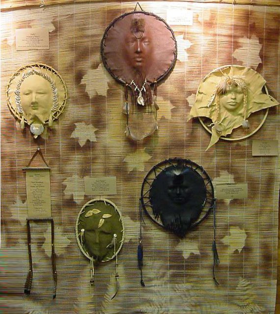 "Huska," the golden girl with corn silk braids, is one of the author's favorite masks. She was returned only to be stolen again! She is still out there somewhere, and if anyone sees her, the author would appreciate an email or for her to be returned. She has "Shama Shamam" written on the bottom of the leather portion, corn silk braided hair, and corn husk paper-like bangs. Additionally, "Drummer's Boy," a golden leather mask of a young boy, is missing but not part of this particular theft. This mask had a picture of a native drummer burned into the leather to the left of the stretched face of the boy. It was stolen from another location a few years later and is still missing.