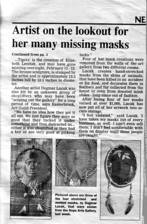 The article below, which was in the local papers, had purposely incorrect information to help the RCMP figure out who knew the real info. In fact, there were five masks stolen, not four as stated in the article. Also, the gallery was broken into during the night, not shoplifted as the article claimed. The RCMP investigators figured that the thieves had a shopping list for specific items before entering the gallery.